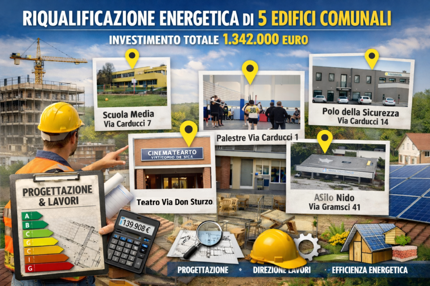 Gli interventi di riqualificazione ed efficientamento energetico riguarderanno cinque strutture comunali individuate come prioritarie per lo stato delle coperture e per la funzione pubblica svolta sul territorio. Le opere interesseranno la scuola secondaria di primo grado di via Carducci 7, le palestre della scuola media di via Carducci 1, il teatro di via Don Luigi Sturzo, il Polo della Sicurezza di via Carducci 14 e l’asilo nido di via Gramsci 41. Si tratta di luoghi centrali per la vita della comunità, nei quali la manutenzione delle coperture incide direttamente sulla sicurezza degli ambienti, sul comfort degli utenti e sui consumi energetici degli edifici.