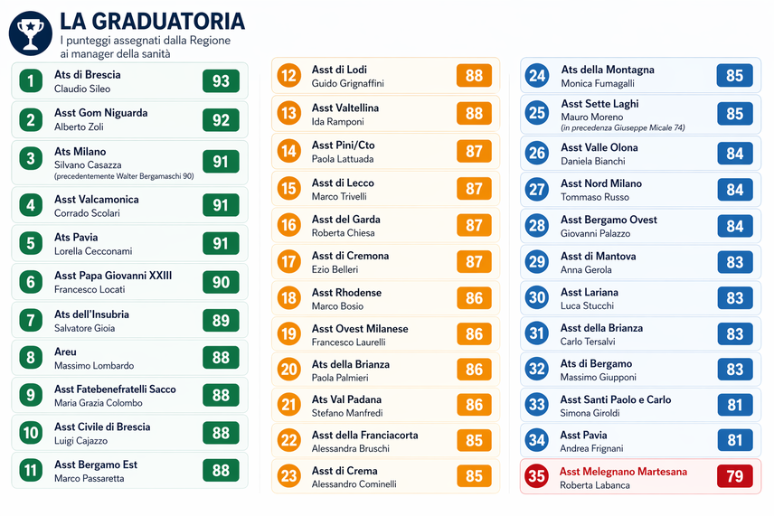 In cima alla classifica c'è Claudio Sileo, direttore dell'Ats di Brescia, con 93 punti. L'anno scorso era già arrivato a 92. Poco sotto troviamo Alberto Zoli, numero uno dell'ospedale Niguarda di Milano (92 punti): ha gestito i complicati preparativi sanitari per le Olimpiadi invernali, e la Regione gliene ha dato atto. Terzo posto a quota 91, condiviso da Silvano Casazza dell'Ats di Milano, da Corrado Scolari dell'Asst Valcamonica e da Lorella Cecconami dell'Ats di Pavia — quest'ultima, però, è scesa rispetto ai 96 punti dell'anno scorso, quando guidava la classifica. La maggior parte dei direttori si colloca tra 83 e 89 punti, con una media generale in crescita rispetto al 2024.